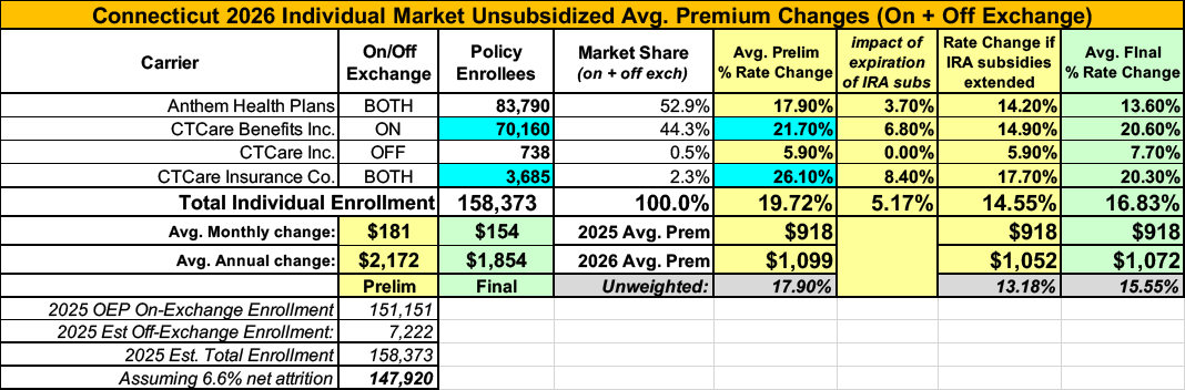 2026 Final Gross Rate Changes - Connecticut: +16.8%; ~156,000 enrollees are in for a major shock this fall (updated)