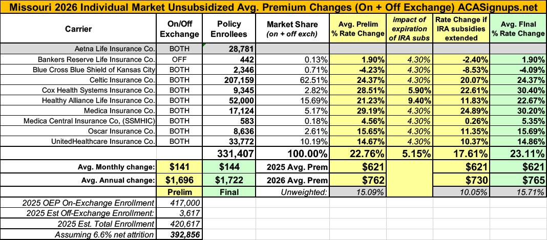 2026 Final Gross Rate Changes - Missouri: +23.1%; ~417,000 enrollees looking at massive rate hikes in January (updated)