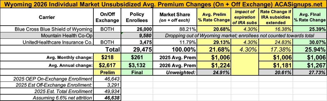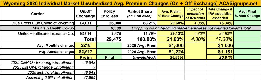 UPDATE 8/14/25: As explained in more detail here, Mountain Health Co-Op just announced they're dropping out of the Wyoming market entirely after all, meaning their ~9,600 enrollees will have to choose one of the other carriers. This also means the weighted average rate increase drops by several points to 21.7%. I've updated the table below to reflect this: