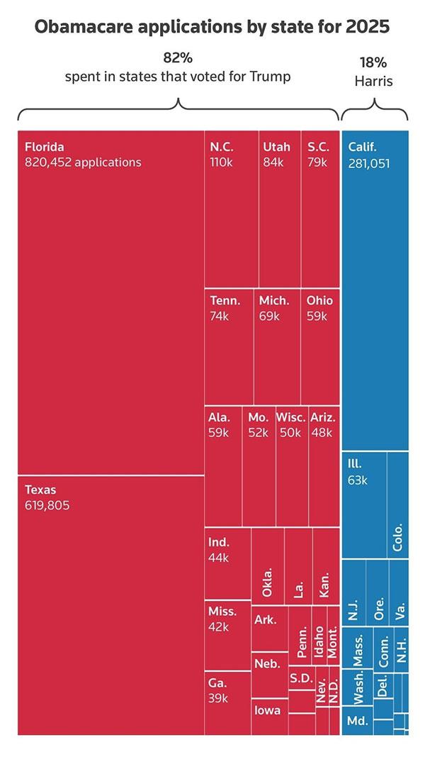 The graph purported to break out "Obamacare applications by state for 2025" by states which voted for Donald Trump vs. those which voted for Kamala Harris in November 2024. Here's what it looked like: