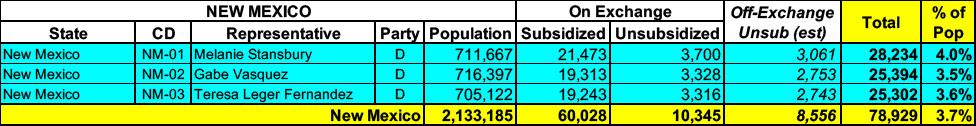 New Mexico has around ~70,000 residents enrolled in ACA exchange plans, 85% of whom are currently subsidized. I estimate they also have another ~8,000 unsubsidized off-exchange enrollees.