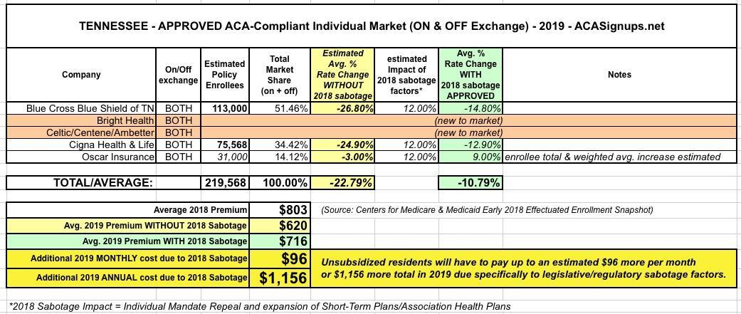 To my knowledge, there are actually 6 individual market carriers in Tennessee this year: Aetna, TRH (Tennessee Rural Health), Blue Cross Blue Shield, Cigna, Humana and "Freedom Life" (which, again, is basically a phantom carrier with no enrollees). Aetna and Humana are out, so that leaves TRH, BCBSTN and Cigna. TRH doesn't appear to have submitted an official 2018 rate filing as of yet, but they only had 3,500 enrollees this time last year anyway, so likely won't have much impact on the overall weighted average rate hikes.